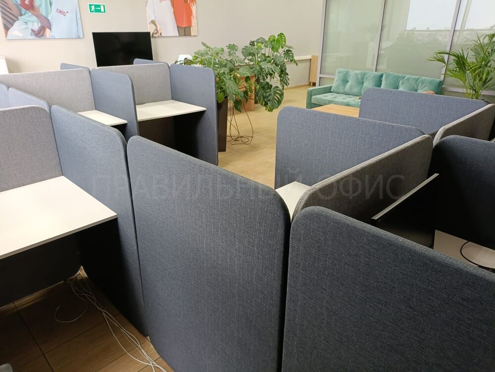 Было обустроено 12 рабочих мест для сотрудников технической поддержки, используя серию мебели для Call-центров в белом цвете ЛДСП в сочетании с разными оттенками мягких тканевых перегородок (Romeo-10 и Romeo-13).